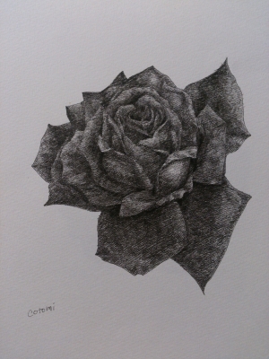 プロフィールにも使用している絵です。 0.03ミリのペンのみで、下書きはせず、写真を見て描きました。 写真は、村上卓司さんという方のバラの写真です。 とても美しく、魅力的だったので、描きました。 下書きをしないのは、私のこだわりです。 感じたこと、考えたことはその時その一瞬で描きとめたい。 写真も、その一瞬を切り取っている作品です。 なのでその写真を一瞬見たら、あとはそのまま自分の目の前にある紙に映し出す。 写真を描くことは絵の勉強にならないという方もいらっしゃいます。 実...