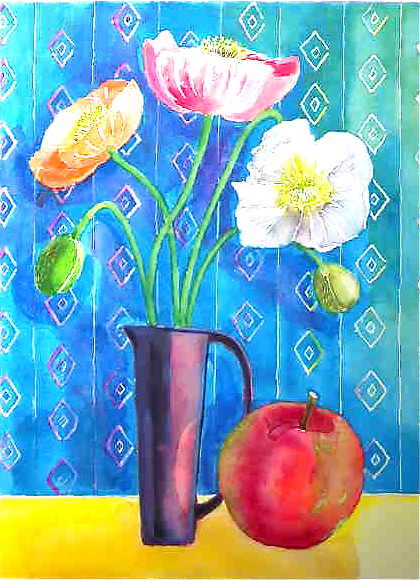 JUGEMテーマ:水彩画。鉛筆画。 JUGEMテーマ:絵・イラスト・挿絵背景に壁紙を配して、少し装飾的な感じにしてみましたが私なりに冒険はしてみたつもりですが、なかなか抜け出せない!!『 ポピーと林檎 』 ラングトン水彩紙 F6サイズ にほんブログ村