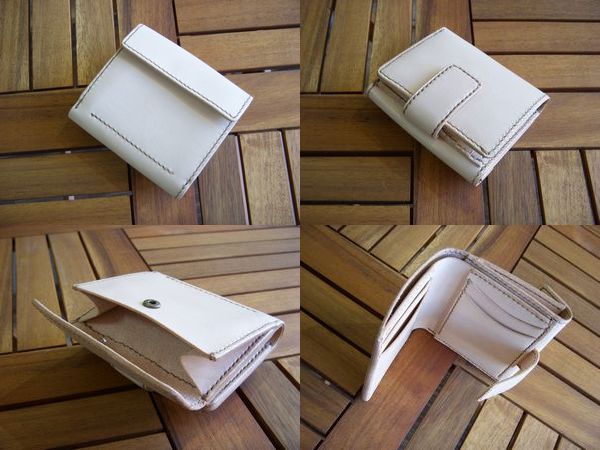 JUGEMテーマ:オーダーメード 飯能レザーハンドメイド&革小物雑貨店 Cuir house キュイールハウス 店長のmatsuです。 2つ折り財布のオーダーいただきました。 ご来店でのオーダーでした。 今後、定番化を予定していた財布のサンプルを確認していただいたところ、 この形でお願いしたいとのことで、革の色、ステッチ(糸)の色の指定をいただき 作成させていただきました。 外側に小銭入れを配置して、内部には札入れ1か所、 カードポケット4か所の必要最低限の機能にまとめました。 革の経年変化を愉...
