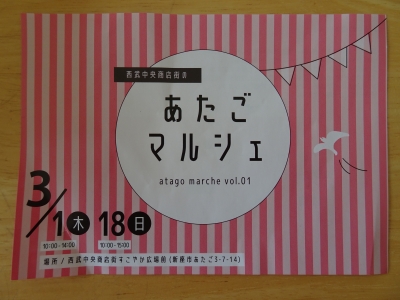 JUGEMテーマ:ハンドメイドイベント PCのある部屋が寒すぎて すっかりブログを放置しておりました。 2月に入って更新してなかったんですね(汗) 今月はイベントお休みで のんびり過ごしていましたが 3月は1日のあたごマルシェに参加します。 新座市あたごの 西部中央商店街すこやか広場前にて 10:00〜14:00です。 新座駅と清瀬駅からバスがあるようです。 団地センターで下車してすぐ。 駐車場もありますよ。 欠品して...