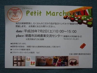 JUGEMテーマ:ハンドメイドイベント あとちょっとで6月も終わりですね〜。 7月はプチマルシェが2回ありますよ! まずは7月2日、 朝霞市浜崎農業交流センターにて。 新鮮なお野菜の試食も出来ますよ。 そして7月10日、 尾崎ファームさんにて。 こちらも尾崎さんの新鮮野菜が買えます! 私は7月10日の方に参加します^^ ぜひ遊びに来てくださーい♪