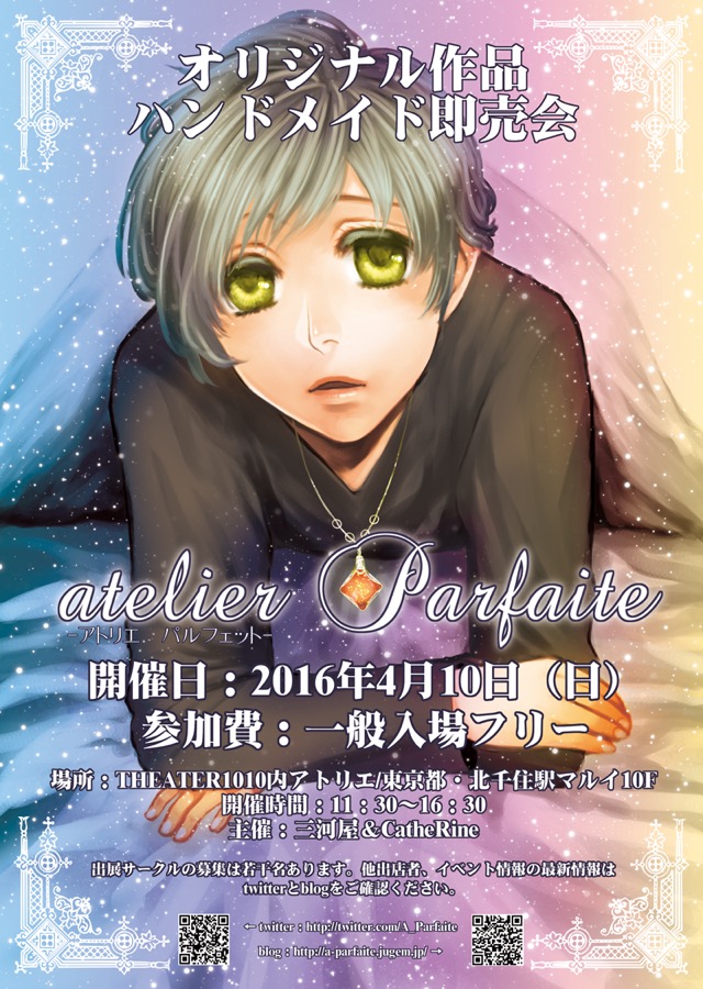 イベント名:「atelier Parfaite(あとりえぱるふぇっと)」開催日:2016年4月10日(日曜日) 開催時間:11:30〜16:30(5時間)※変動あり 参加者入場時間:10:00〜17:30 一般参加費:無料 開催場所:THEATRE1010 (シアターセンジュ)北千住マルイ10Fアトリエ 主催:三河屋&CatheRineイベント告知用ツイッター:http://twitter.com/A_Parfaite JUGEMテーマ:ハンドメイドイベント