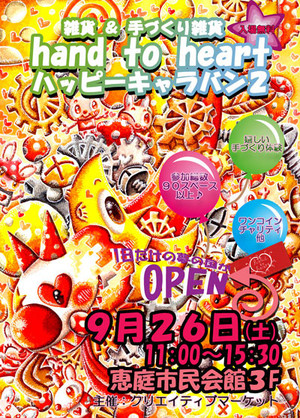 すっかりアナウンス忘れのイベント情報です。 お近くにお越しの際はお立ち寄りいただけると嬉しいです。 って本人不在の場合もありますけど・・・。 スミマセン。 hand to heart 華月〜はなつき in地下歩行空間 10月4日(日)5日(月)11時〜19時 地下歩行空間 憩いの広場 OWN WAY CAFE 雑貨Market 10月12日(祝)、13日(火)、14日(水) OWN WAY CAFE(札幌市東区北23条東13丁目)委託販売です オータムフェスト〜ア・ラ・マン〜2015 10月19日(月)〜24日(土)10時〜17時 大町ミニギャラリー(伊達市大町3-7)...
