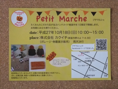 JUGEMテーマ:ハンドメイドイベント バタバタしているうちに10月になってしまいました。 せっかくフライヤー貰ってきていたのに アップするのを忘れていましたよ>< そんなわけで10月18日、 カクイチさんでのプチマルシェに向けて ただいま絶賛製作中。 ですがあんまり進みが良くなくて ちょっと不安になっております。 買い出しにも行きたいけど、 いつ出かけるかが悩みどころ。 あまり欲張らず、 出来ることを1つずつ消化していこうと思います。 でも、 とわに席を奪われると作業...