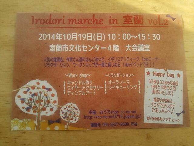イベントが決まりました。 イロドリマルシェ vol.2 10月19日(日)10時〜15時30分 室蘭市民文化センター4階 大会議室 お話をいただいた時に 自分でいいのか?と悩みましたが これもご縁と思い、お話を進めさせていただきました。 室蘭市ではco-no-miさん 伊達市ではBeads Jewelさんに 作品をお願いしています。 なかなか直接お話できる機会がないので 楽しみにしています。 ・・・と言っても店主、人見知りですが話しかけられると 嬉しくて小躍りします(笑) 今回はリクエストにより くろーばー市で楽しんで...