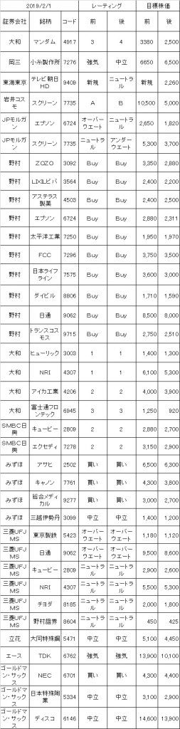 JUGEMテーマ:株・投資 JUGEMテーマ:株式投資、FX 2019/2/7 レーティング 目標株価 証券会社 銘柄 コード 前 後 前 後 大和 東洋水産 2875 3 2 4,000 4,500 東海東京 岡谷鋼機 7485 新規 アウトパフォーム 新規 12,000 水戸 アイペット 7323 B+ A 5,600 5,500 野村 サンバイオ 2897 ...