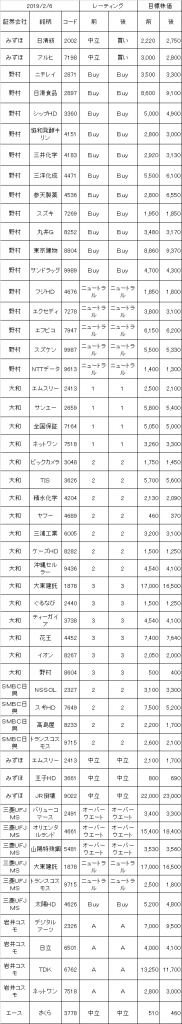 JUGEMテーマ:株・投資 JUGEMテーマ:株式投資、FX 2019/2/8 レーティング 目標株価 証券会社 銘柄 コード 前 後 前 後 三菱UFJMS T&DHD 8795 オーバーウエート ニュートラル 2,000 1,550 岩井コスモ 神戸物産 3038 新規 A 新規 4,100 ゴールドマン・サックス SUBARU 7270 買い コンビクション買い 4,000 ...