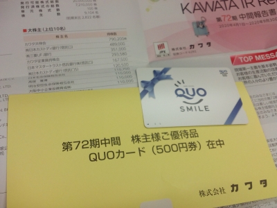 カワタちゃんから けっこーまえに 馬株主優待貧の クオカードが とどいていますた! カワタちゃん ありがとー! (株)カワタ (6292) 権利確定月 3月末日・9月末日 単元株数 100株 株主優待の内容 QUOカード <3月末・9月末> 100株以上 500円相当 JUGEMテーマ:株主優待 にほんブログ村 川田瑠南 美人動画MAX ...