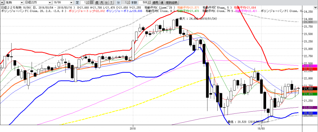 JUGEMテーマ:株・投資 JUGEMテーマ:日経225先物 JUGEMテーマ:トレード手法 日経225先物 ブログ トレード戦略20180315 ナイトは下げました アメリカダウも下げたので本日の寄り付きはどうでしょうか 本日の方針として 日足的には高値切下げ、安値切下げの売り優勢です 21500円で買いも入るので、 下値も限定的かもしれないです。 上値も920から410までの半値でとまる可能性もある ようはレンジの可能性も高いです。 &...