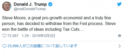 JUGEMテーマ:デフレ・インフレ 米国で5/2にスティーブン・ムーア氏がFRB理事を辞任するというニュースがありました。今日は、そのニュースを取り上げ、「絶好調の米国経済も、マイルドなデフレに突入か?」と題して論説します。 下記はブルームバーグの記事です。 『2019/05/03 03:53 ムーア氏、FRB理事候補を辞退−トランプ大統領 トランプ大統領は2日、スティーブン・ムーア氏が連邦準備制度理事会(FRB)理事候補の辞退を決めたとツイートした。 ムーア氏は現在空...