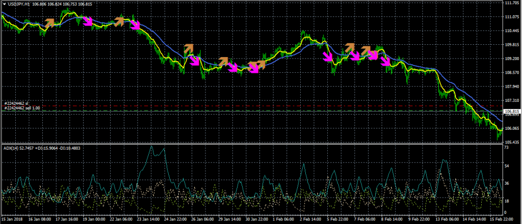JUGEMテーマ:FXツール情報 JUGEMテーマ:FX初心者 移動平均線だけでは売買サインが出すぎるので、ADX(オシレータ系のテクニカル)でフィルタしてみましたが、あまり効果がありませんでした。 ADXってどんなテクニカル指標でしょう。下段がADXです。(正しくはDMI/ADX指標のようです) ADX(Average Directional Movement Index)の表示には、3本のラインが引かれています。 ・ADX(青のライン):トレンドの強さ ・+DI(緑の点線):上昇の強さ ・-DI(白の点...