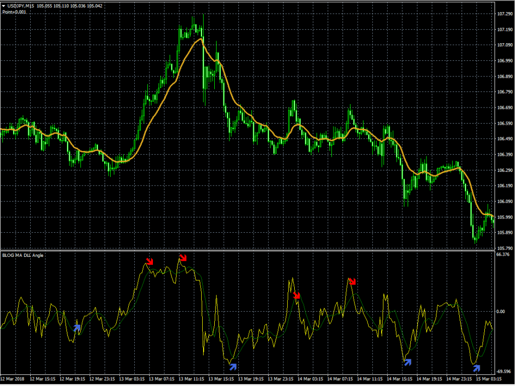 JUGEMテーマ:FXツール情報 オリジナルインジケータ「EMA角度インジケータ」を見ていると、なんか使えそうだなーと思い第2弾を作成しました。 「EMA角度インジケータで売買サイン」と「EMA角度SMA」・・・ややこしい。 1.EMA角度をスーパーシグナルのように一定期間のTOP/BOTTOMを売買サインにしています。 2.EMA角度を単純移動平均で平均化しています。 まぁ、見てみましょう。 チャート表示にはEMAを表示しています。 下のウィンドウに「EMA角度インジケータ...