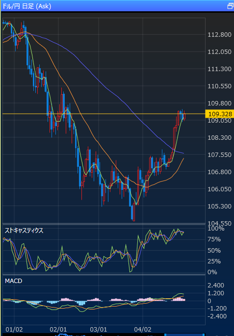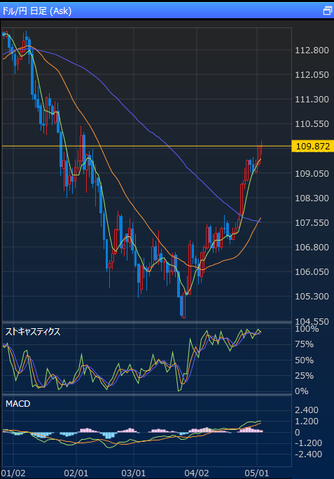 JUGEMテーマ:外為(FX)初心者でもよくわかる外国為替取引(FX)入門 109円を超えたあたりで、上昇が停滞している。 日本がGWということもあり、東京市場での動きは鈍い。 昨日は、109.45までじり高推移したのち、日付が変わるころに失速した。 ダウ平均が下落したことを見てのことと思われる。 その後、戻して109.3あたりで終えた。 今日あげれば、中期移動平均(オレンジ)が、長期移動平均(青)を抜くゴールデンクロスを形成する。 ...