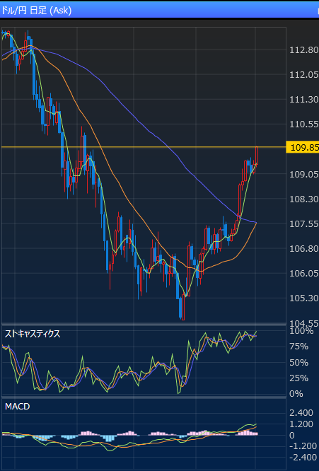 JUGEMテーマ:外為(FX)初心者でもよくわかる外国為替取引(FX)入門 とうとう、中期移動平均(オレンジ)が、長期移動平均(青)を抜くゴールデンクロスを形成してきた。 110円が、ターゲットとして見えてきた。 110.5を超すと、上昇に弾みがつくと言われている。 今日は、押し目を狙って買いを入れたい。 昨日は、109.65と、109.85あたりで決済して、合計で +12、000くらいの利益を確定した。 ストキャスティクスは、相変わらず100%に張り付...