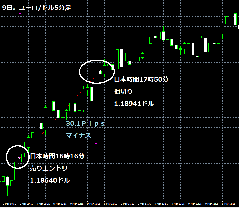 JUGEMテーマ:FX 情報分析 3月9日のOANDA JAPANのデモトレードで自作EA「ロンドンは午前7時」(旧バージョン)は、日本時間16時16分にユーロ/ドルのショートポジション(ユーロ売りドル買い)を1.18640ドルでエントリーし日本時間17時50分に1.18941ドルでポジションをクローズし30.1Pipsのマイナスで16,388円の損失となった。(Lot数は0.5。5万通貨) 2019年2月26日からのフォワードテスト261勝125敗(261勝/385トレード、勝率67.79%、引き分け含まず)で740.5pipsのプラスで42万8,216円の利益となった。 OANDA JA...