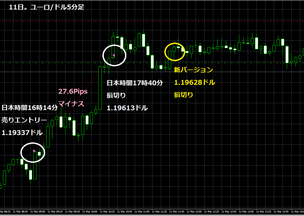 JUGEMテーマ:FX 情報分析 3月30日のOANDA JAPANのリアルトレードで自作EA「ロンドンは午前7時」(新バージョン)は、日本時間14時50分にユーロ/ドルのロングポジション(ユーロ買いドル売り)を1.17616ドルでエントリーし日本時間20時15分に1.17310ドルでポジションをクローズし30.6Pipsのマイナスで16,916円の損失となった。(Lot数は0.5。5万通貨) 3月31日のOANDA JAPANのリアルトレードで自作EA「ロンドンは午前7時」(新バージョン)は、日本時間15時32分にユーロ/ドルのショートポジション(ユーロ売りドル買い)...