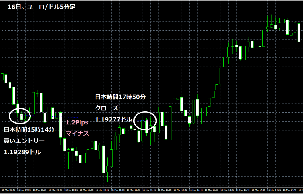 JUGEMテーマ:FX 情報分析 3月16日のOANDA JAPANのデモトレードで自作EA「ロンドンは午前7時」(旧バージョン)は、日本時間15時14分にユーロ/ドルのロングポジション(ユーロ買いドル売り)を1.19289ドルでエントリーし日本時間17時50分に1.19277ドルでポジションをクローズし1.2Pipsのマイナスで657円の損失となった。(Lot数は0.5。5万通貨) 2019年2月26日からのフォワードテスト261勝127敗(261勝/387トレード、勝率67.44%、引き分け含まず)で711.7pipsのプラスで41万2,554円の利益となった。 OANDA JAPANの...