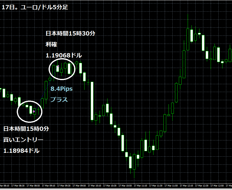 JUGEMテーマ:FX 情報分析 3月17日のOANDA JAPANのデモトレードで自作EA「ロンドンは午前7時」(旧バージョン)は、日本時間15時00分にユーロ/ドルのロングポジション(ユーロ買いドル売り)を1.18984ドルでエントリーし日本時間15時30分に1.19068ドルでポジションをクローズし8.4Pipsのプラスで4,573円の利益となった。(Lot数は0.5。5万通貨) 2019年2月26日からのフォワードテスト262勝127敗(262勝/388トレード、勝率67.53%、引き分け含まず)で720.1pipsのプラスで41万7,127円の利益となった。 OANDA JAPANの...