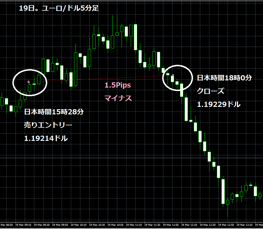 JUGEMテーマ:FX 情報分析 3月19日のOANDA JAPANのデモトレードで自作EA「ロンドンは午前7時」(旧バージョン)は、日本時間15時28分にユーロ/ドルのショートポジション(ユーロ売りドル買い)を1.19214ドルでエントリーし日本時間18時00分に1.19229ドルでポジションをクローズし1.5Pipsのマイナスで817円の損失となった。(Lot数は0.5。5万通貨) 2019年2月26日からのフォワードテスト262勝128敗(262勝/389トレード、勝率67.35%、引き分け含まず)で718.6pipsのプラスで41万6,310円の利益となった。 OANDA JAPAN...