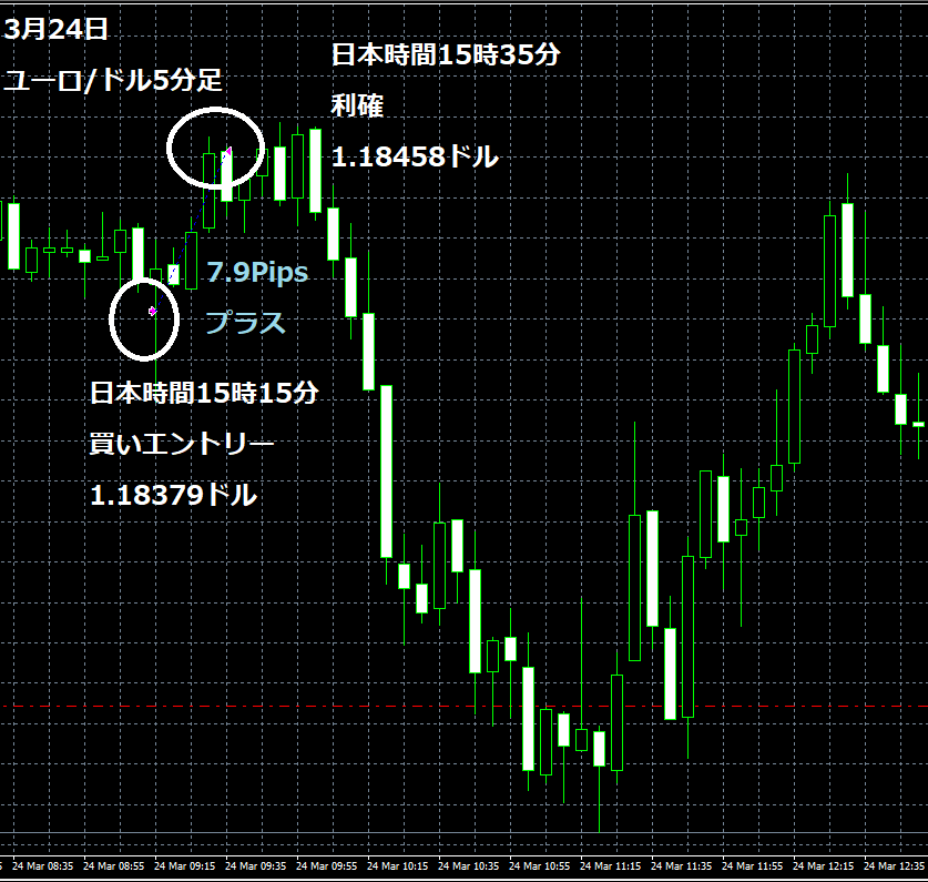 JUGEMテーマ:FX 情報分析 3月24日のOANDA JAPANのデモトレードで自作EA「ロンドンは午前7時」(旧バージョン)は、日本時間15時15分にユーロ/ドルのロングポジション(ユーロ買いドル売り)を1.18379ドルでエントリーし日本時間15時35分に1.18458ドルでポジションをクローズし7.9Pipsのプラスで4,277円の利益となった。(Lot数は0.5。5万通貨) 2019年2月26日からのフォワードテスト263勝128敗(263勝/390トレード、勝率67.44%、引き分け含まず)で726.5pipsのプラスで42万587円の利益となった。 OANDA JAPANのデ...