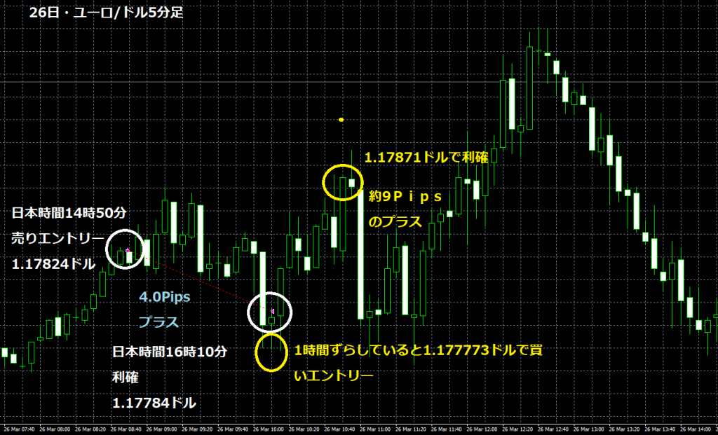 JUGEMテーマ:FX 情報分析 3月26日のOANDA JAPANのデモトレードで自作EA「ロンドンは午前7時」(旧バージョン)は、日本時間14時50分にユーロ/ドルのショートポジション(ユーロ売りドル買い)を1.17824ドルでエントリーし日本時間16時10分に1.17784ドルでポジションをクローズし4.0Pipsのプラスで2,181円の利益となった。(Lot数は0.5。5万通貨) 2019年2月26日からのフォワードテスト264勝128敗(264勝/391トレード、勝率67.52%、引き分け含まず)で730.5pipsのプラスで42万2,768円の利益となった。 OANDA JAPAN...