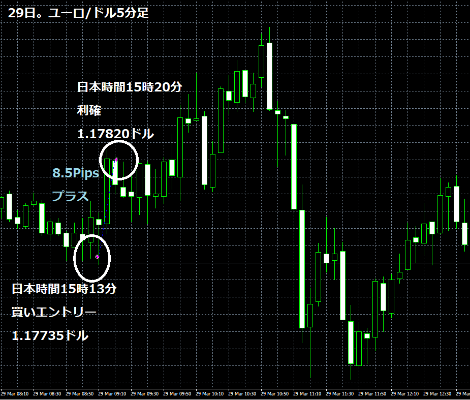 JUGEMテーマ:FX 情報分析 3月29日のOANDA JAPANのデモトレードで自作EA「ロンドンは午前7時」(旧バージョン)は、日本時間15時13分にユーロ/ドルのロングポジション(ユーロ買いドル売り)を1.17735ドルでエントリーし日本時間15時20分に1.17820ドルでポジションをクローズし8.5Pipsのプラスで4,644円の利益となった。(Lot数は0.5。5万通貨) 2019年2月26日からのフォワードテスト265勝128敗(265勝/392トレード、勝率67.60%、引き分け含まず)で739.0pipsのプラスで42万7,412円の利益となった。 OANDA JAPANの...