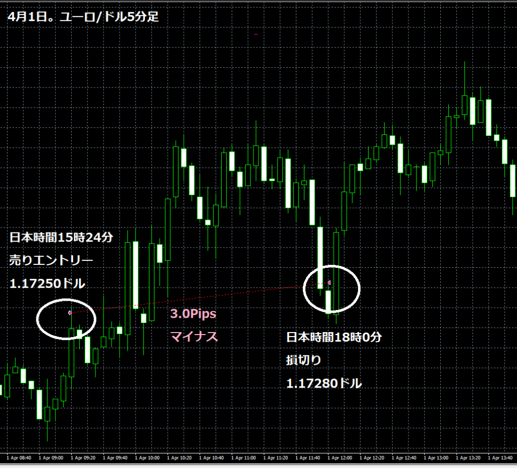 JUGEMテーマ:FX 情報分析 4月1日のOANDA JAPANのリアルトレードで自作EA「ロンドンは午前7時」(新バージョン)は、日本時間15時24分にユーロ/ドルのショートポジション(ユーロ売りドル買い)を1.17250ドルでエントリーし日本時間18時00分に1.17280ドルでポジションをクローズし3.0Pipsのマイナスで1,665円の損失となった。(Lot数は0.5。5万通貨) 2019年2月26日からのフォワードテスト265勝131敗(265勝/395トレード、勝率67.01%、引き分け含まず)で679.10pipsのプラスで39万4,254円の利益となった。 OANDA J...