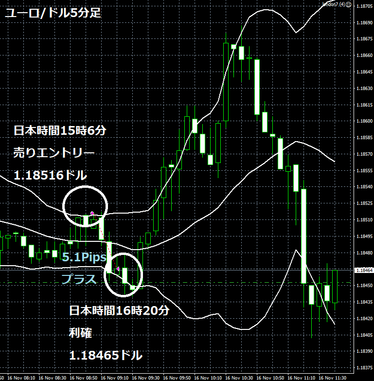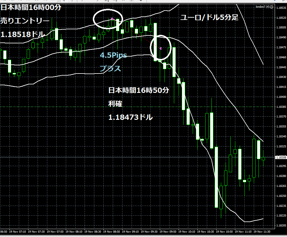 JUGEMテーマ:FX 情報分析 11月19日のOANDA JAPANのデモトレードで自作EA「ロンドンは午前7時」は、日本時間16時00分にユーロ/ドルのショートポジション(ユーロ売りドル買い)を1.18518ドルでエントリーし日本時間16時50分に1.18473ドルでポジションをクローズし4.5Pipsのプラスで2,332円の利益となった。(Lot数は0.5。5万通貨) 2019年2月26日からのフォワードテスト222勝108敗(222勝/329トレード、勝率67.48%、引き分け含まず)で649.8pipsのプラスで38万1,815円の利益となった。 OANDA JAPANのデモ口座のスプ...