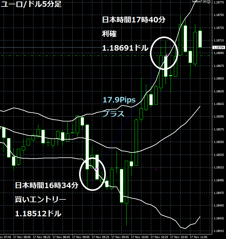 JUGEMテーマ:FX 情報分析 11月17日のOANDA JAPANのデモトレードで自作EA「ロンドンは午前7時」は、日本時間16時34分にユーロ/ドルのロングポジション(ユーロ買いドル売り)を1.18512ドルでエントリーし日本時間17時40分に1.18691ドルでポジションをクローズし17.9Pipsのプラスで9,315円の利益となった。(Lot数は0.5。5万通貨) 2019年2月26日からのフォワードテスト221勝107敗(221勝/327トレード、勝率67.58%、引き分け含まず)で647.0pipsのプラスで38万368円の利益となった。 OANDA JAPANのデモ口座のスプレ...