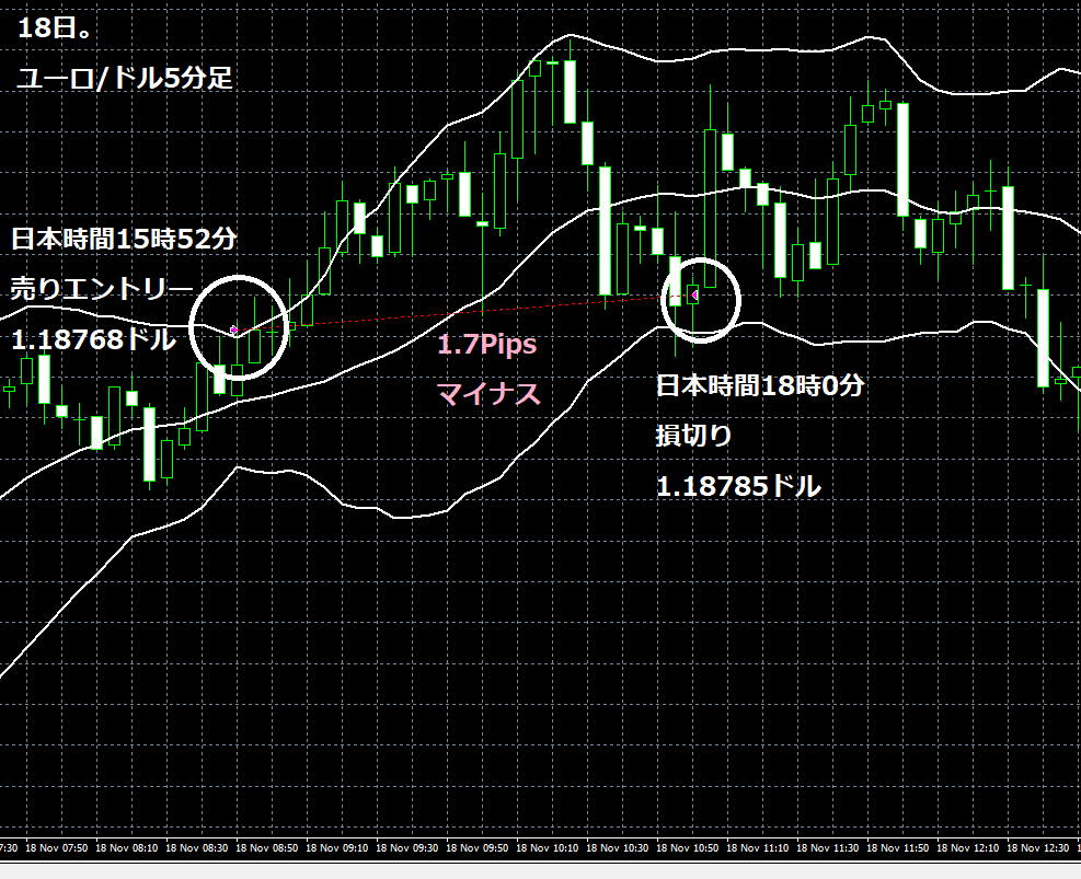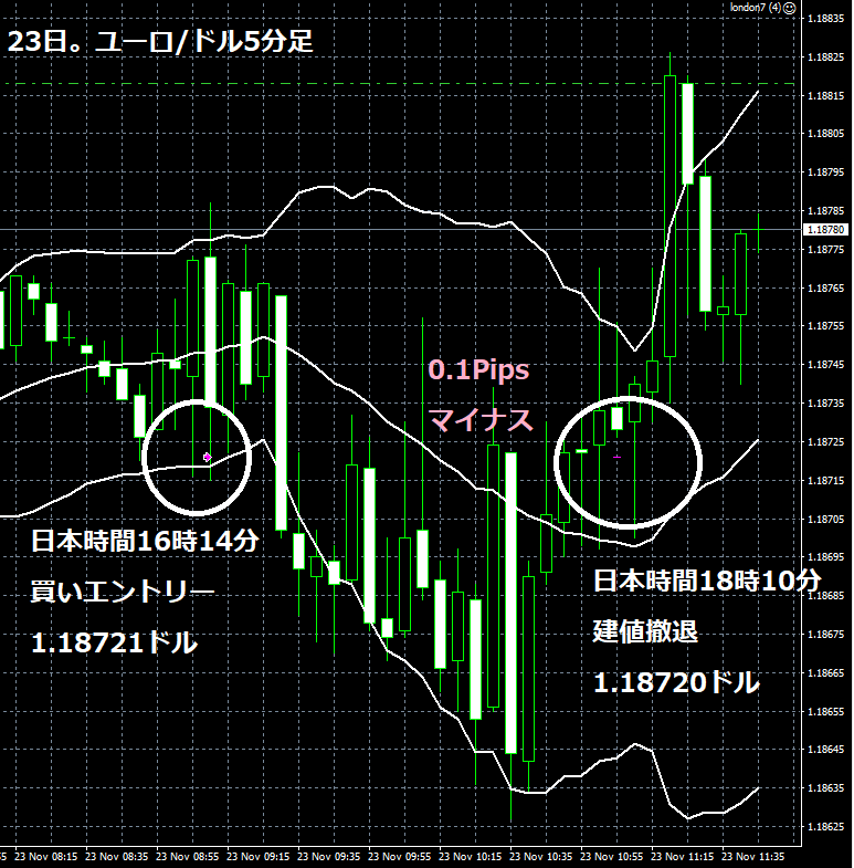 JUGEMテーマ:FX 情報分析 11月23日のOANDA JAPANのデモトレードで自作EA「ロンドンは午前7時」は、日本時間16時14分にユーロ/ドルのロングポジション(ユーロ買いドル売り)を1.18721ドルでエントリーし日本時間18時10分に1.18720ドルでポジションをクローズし0.1Pipsのマイナスで52円の損失となった。(Lot数は0.5。5万通貨) 2019年2月26日からのフォワードテスト222勝110敗(222勝/331トレード、勝率67.07%、引き分け含まず)で624.8pipsのプラスで36万8,808円の利益となった。 OANDA JAPANのデモ口座のスプレッ...