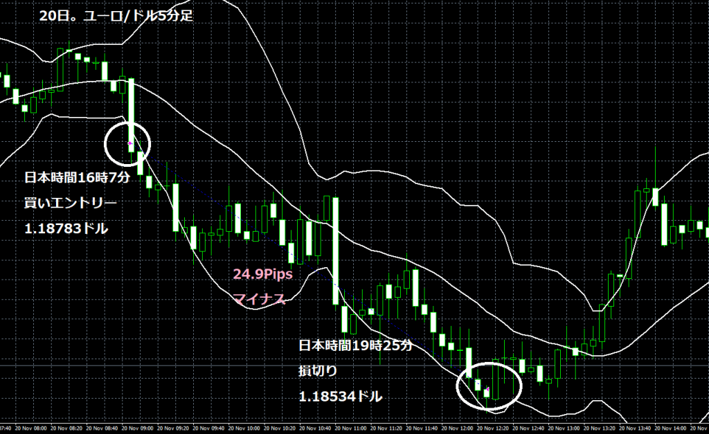 JUGEMテーマ:FX 情報分析 11月20日のOANDA JAPANのデモトレードで自作EA「ロンドンは午前7時」は、日本時間16時07分にユーロ/ドルのロングポジション(ユーロ買いドル売り)を1.18783ドルでエントリーし日本時間19時25分に1.18534ドルでポジションをクローズし24.9Pipsのマイナスで12,955円の損失となった。(Lot数は0.5。5万通貨) 2019年2月26日からのフォワードテスト222勝109敗(222勝/330トレード、勝率67.27%、引き分け含まず)で624.9pipsのプラスで36万8,860円の利益となった。 OANDA JAPANのデモ口座の...