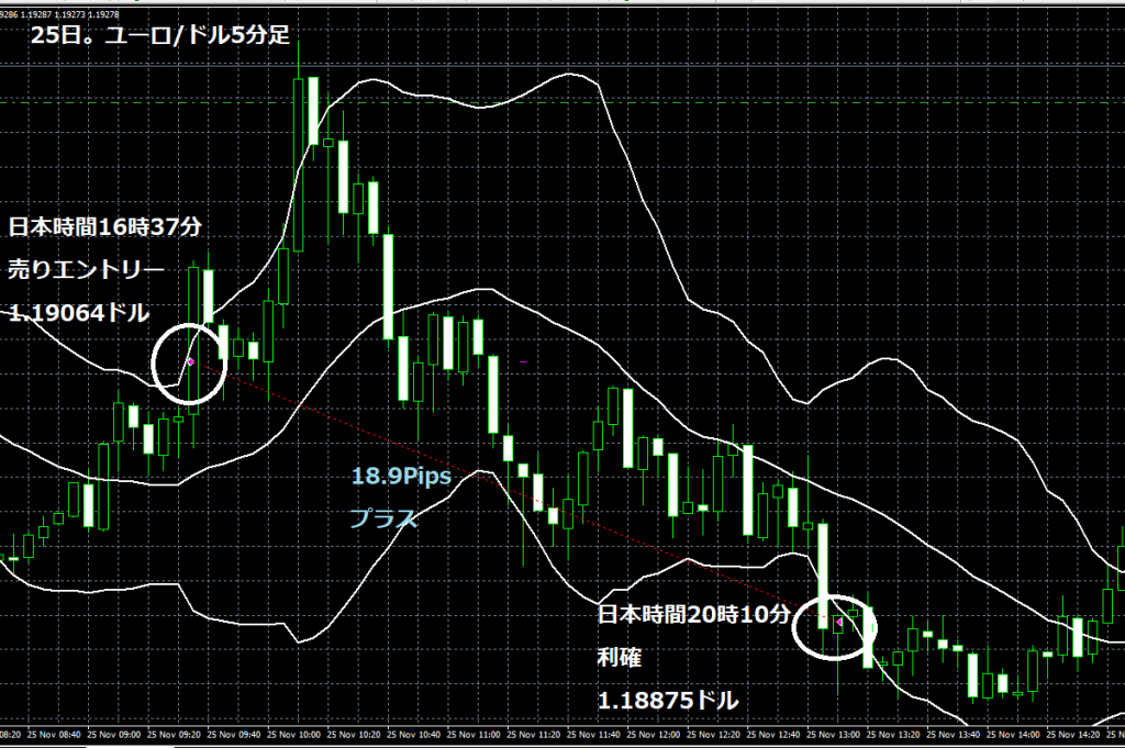 JUGEMテーマ:FX 情報分析 11月25日のOANDA JAPANのデモトレードで自作EA「ロンドンは午前7時」は、日本時間16時37分にユーロ/ドルのショートポジション(ユーロ売りドル買い)を1.19064ドルでエントリーし日本時間20時10分に1.18875ドルでポジションをクローズし18.9Pipsのプラスで9,853円の利益となった。(Lot数は0.5。5万通貨) 2019年2月26日からのフォワードテスト223勝110敗(223勝/332トレード、勝率67.17%、引き分け含まず)で643.7pipsのプラスで37万8,661円の利益となった。 OANDA JAPANのデモ口座のス...