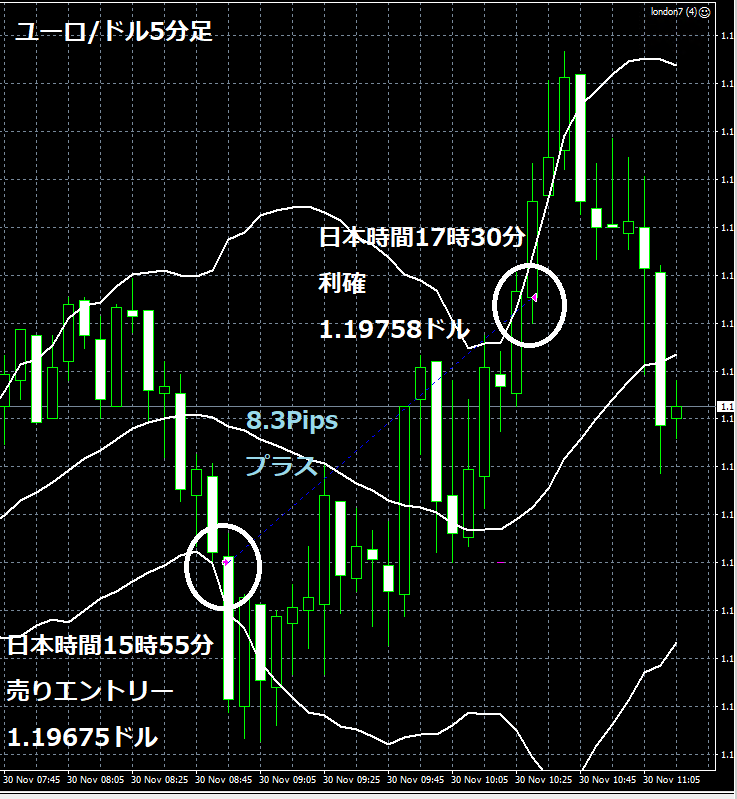 JUGEMテーマ:FX 情報分析 11月30日のOANDA JAPANのデモトレードで自作EA「ロンドンは午前7時」は、日本時間15時55分にユーロ/ドルのロングポジション(ユーロ買いドル売り)を1.19675ドルでエントリーし日本時間17時30分に1.19758ドルでポジションをクローズし8.3Pipsのプラスで4,314円の利益となった。(Lot数は0.5。5万通貨) 2019年2月26日からのフォワードテスト225勝110敗(225勝/334トレード、勝率67.37%、引き分け含まず)で657.7pipsのプラスで38万5,936円の利益となった。 OANDA JAPANのデモ口座のスプ...