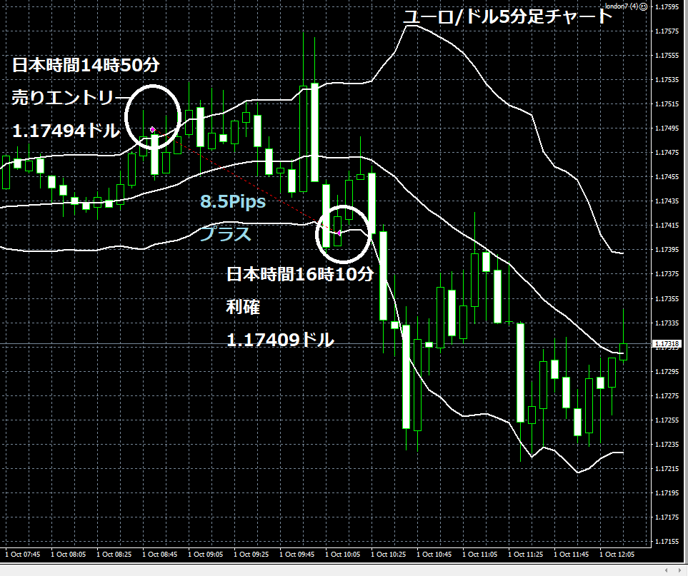 JUGEMテーマ:FX 情報分析 10月1日のOANDA JAPANのデモトレードで自作EA「ロンドンは午前7時」は、日本時間14時50分にユーロ/ドルのショートポジション(ユーロ売りドル買い)を1.17494ドルでエントリーし日本時間16時10分に1.17409ドルでポジションをクローズし8.5Pipsのプラスで4,475円の利益となった。(Lot数は0.5。5万通貨) 2019年2月26日からのフォワードテスト202勝103敗(202勝/304トレード、勝率66.45%、引き分け含まず)で548.2pipsのプラスで32万9,033円の利益となった。 OANDA JAPANのデモ口座のスプ...