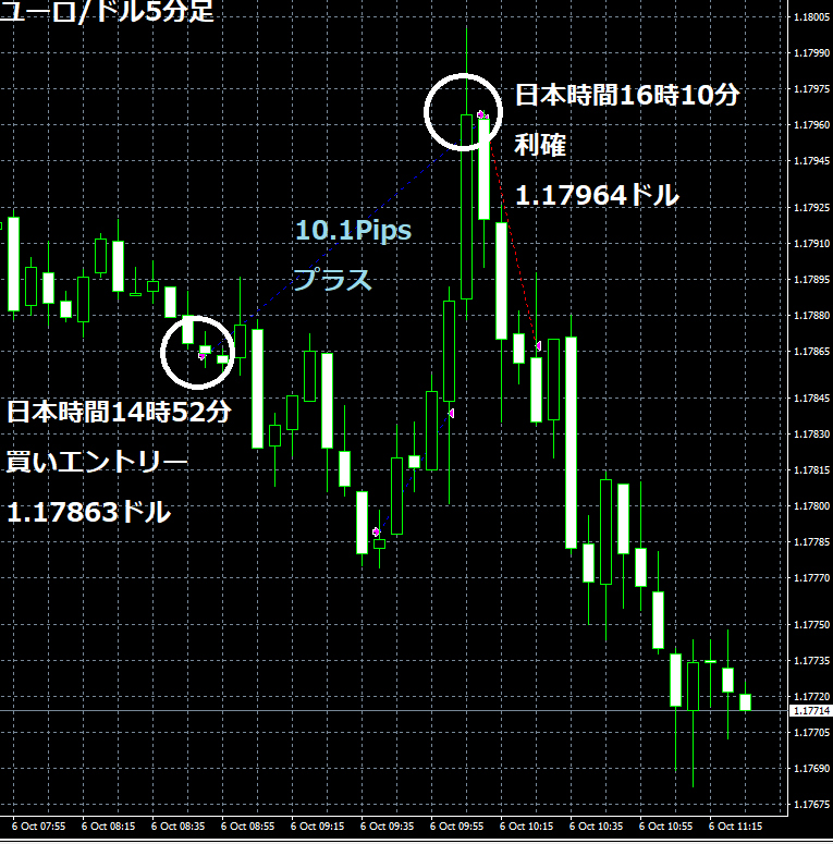 JUGEMテーマ:FX 情報分析 10月6日のOANDA JAPANのデモトレードで自作EA「ロンドンは午前7時」は、日本時間14時52分にユーロ/ドルのロングポジション(ユーロ買いドル売り)を1.17863ドルでエントリーし日本時間16時10分に1.17964ドルでポジションをクローズし10.1Pipsのプラスで5,325円の利益となった。(Lot数は0.5。5万通貨) 2019年2月26日からのフォワードテスト203勝103敗(203勝/305トレード、勝率66.56%、引き分け含まず)で558.3pipsのプラスで33万4,358円の利益となった。 OANDA JAPANのデモ口座のスプ...