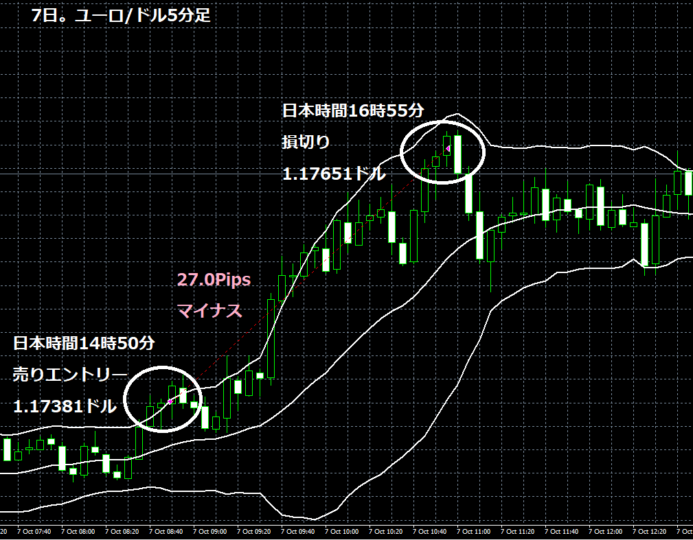 JUGEMテーマ:FX 情報分析 10月7日のOANDA JAPANのデモトレードで自作EA「ロンドンは午前7時」は、日本時間14時50分にユーロ/ドルのショートポジション(ユーロ売りドル買い)を1.17381ドルでエントリーし日本時間16時55分に1.17651ドルでポジションをクローズし27.0Pipsのマイナスで14,324円の損失となった。(Lot数は0.5。5万通貨) 2019年2月26日からのフォワードテスト203勝104敗(203勝/306トレード、勝率66.34%、引き分け含まず)で531.3pipsのプラスで32万34円の利益となった。 OANDA JAPANのデモ口座のス...