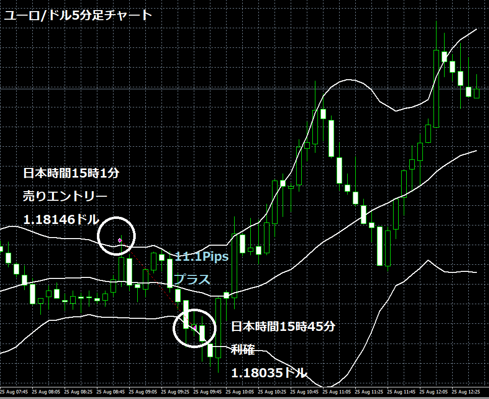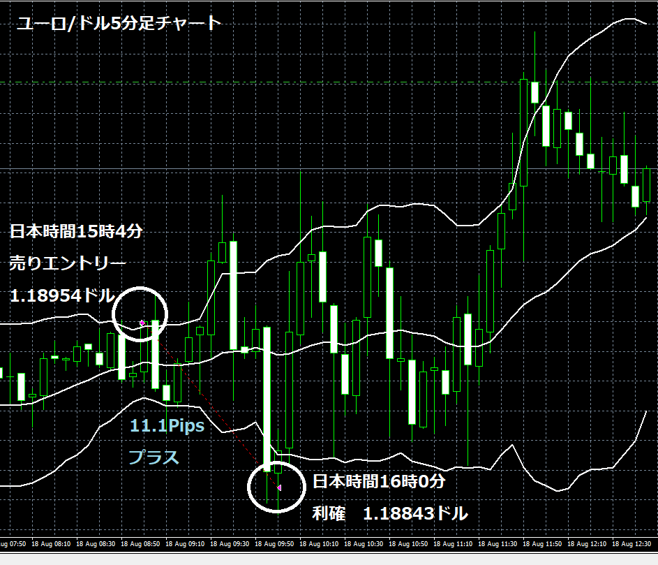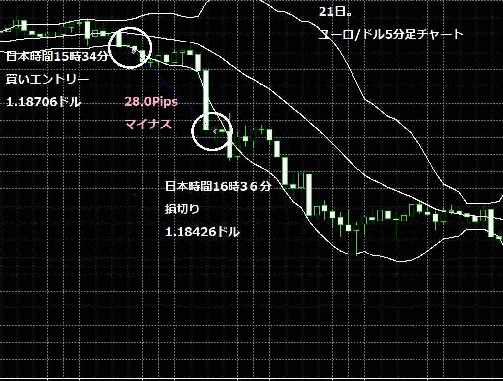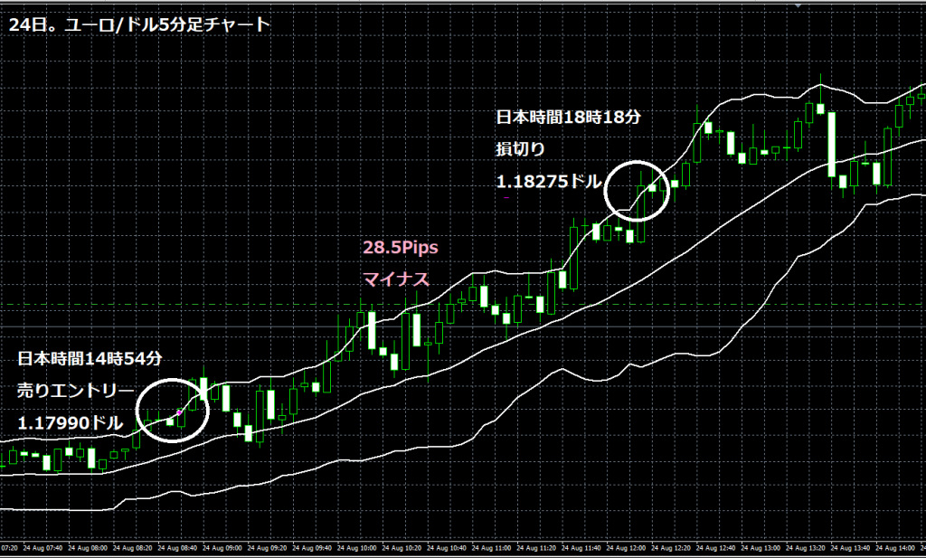 JUGEMテーマ:FX 情報分析 8月21日のOANDA JAPANのデモトレードで自作EA「ロンドンは午前7時」は、日本時間15時34分にユーロ/ドルのロングポジション(ユーロ買いドル売り)を1.18706ドルでエントリーし日本時間16時20分に1.18426ドルでポジションをクローズし28.0Pipsのマイナスで14,807円の損失となった。(Lot数は0.5。5万通貨) この日は、日本時間16時発表のフランスPMIと16時15分発表のドイツPMIがあり、大きく動いた。 PMIの発表のある日は、最初からEAを停止させておくか、発表前に手動でポジションをクローズ...