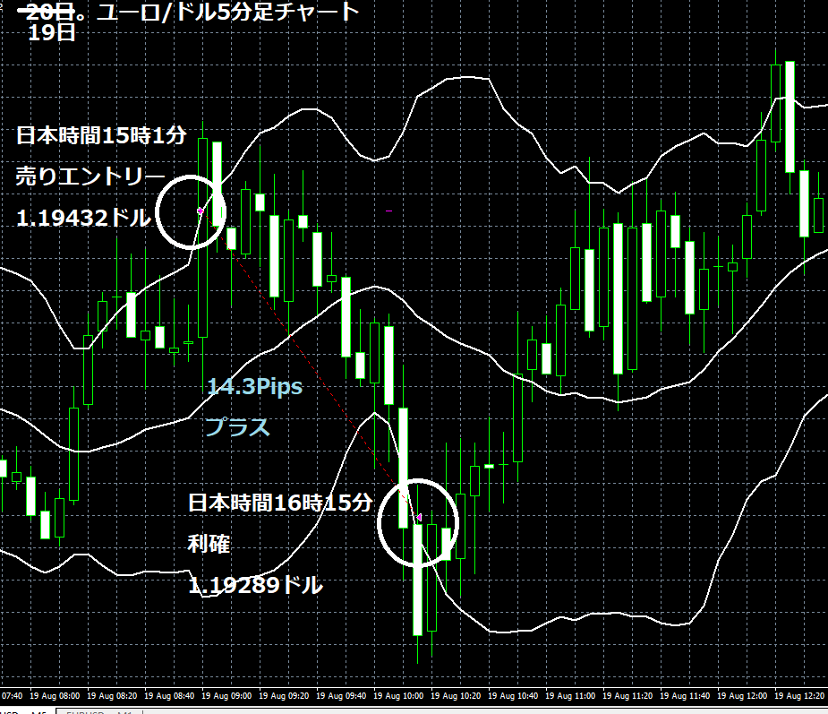 JUGEMテーマ:FX 情報分析 8月19日のOANDA JAPANのデモトレードで自作EA「ロンドンは午前7時」は、日本時間15時01分にユーロ/ドルのショートポジション(ユーロ売りドル買い)を1.19432ドルでエントリーし日本時間16時15分に1.19289ドルでポジションをクローズし14.3Pipsのプラスで7,529円の利益となった。(Lot数は0.5。5万通貨) 2019年2月26日からのフォワードテスト189勝98敗(189勝/286トレード、勝率66.08%、引き分け含まず)で518.8pipsのプラスで31万3,603円の利益となった。 OANDA JAPANのデモ口座のスプ...