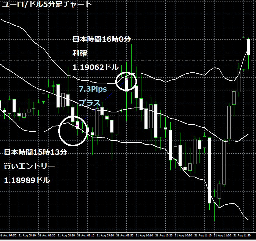 JUGEMテーマ:FX 情報分析 9月3日のOANDA JAPANのデモトレードで自作EA「ロンドンは午前7時」は、日本時間15時03分にユーロ/ドルのロングポジション(ユーロ買いドル売り)を1.17975ドルでエントリーし日本時間16時25分に1.18132ドルでポジションをクローズし15.7Pipsのプラスで9,321円の利益となった。(Lot数は0.5。5万通貨) 2019年2月26日からのフォワードテスト192勝101敗(192勝/292トレード、勝率65.75%、引き分け含まず)で469.5pipsのプラスで28万7,438円の利益となった。 OANDA JAPANのデモ口座のスプレ...