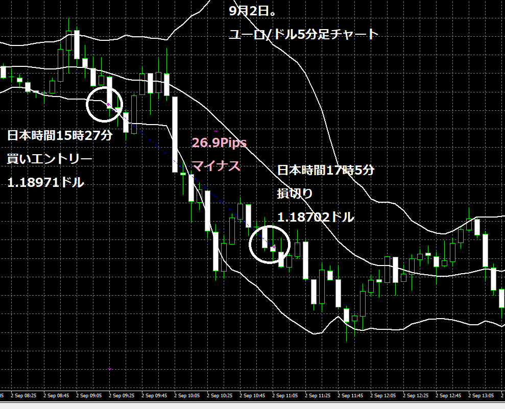 JUGEMテーマ:FX 情報分析 9月2日のOANDA JAPANのデモトレードで自作EA「ロンドンは午前7時」は、日本時間15時27分にユーロ/ドルのロングポジション(ユーロ買いドル売り)を1.18971ドルでエントリーし日本時間17時05分に1.18702ドルでポジションをクローズし26.9Pipsのマイナスで14,296円の損失となった。(Lot数は0.5。5万通貨) 2019年2月26日からのフォワードテスト191勝101敗(191勝/291トレード、勝率65.64%、引き分け含まず)で453.8pipsのプラスで27万9,117円の利益となった。 OANDA JAPANのデモ口座のスプ...