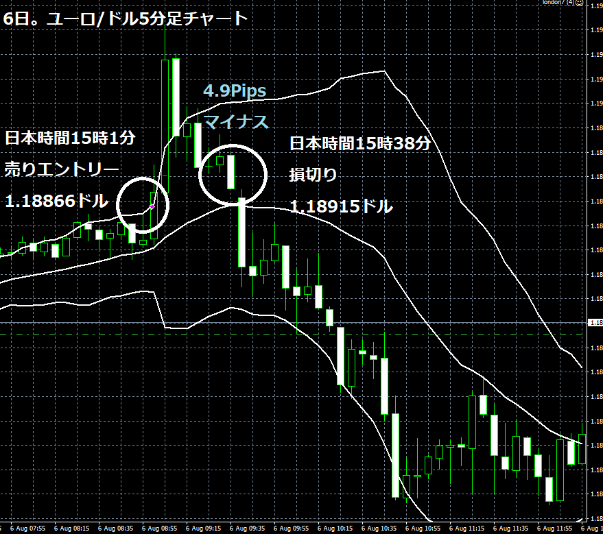 JUGEMテーマ:FX 情報分析 8月6日のOANDA JAPANのデモトレードで自作EA「ロンドンは午前7時」は、日本時間15時01分にユーロ/ドルのショートポジション(ユーロ売りドル買い)を1.18866ドルでエントリーし日本時間15時38分に1.18915ドルでポジションをクローズし4.9Pipsのマイナスで2,590円の損失となった。(Lot数は0.51。5.1万通貨) 2019年2月26日からのフォワードテスト183勝96敗(183勝/278トレード、勝率65.83%、引き分け含まず)で479.8pipsのプラスで29万3,143円の利益となった。 この日は、日本時間の15時にイ...