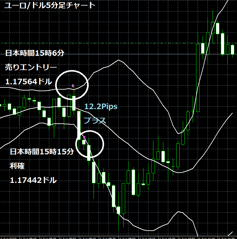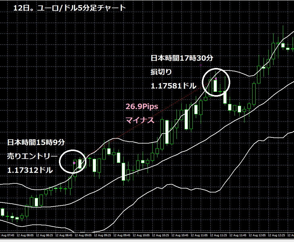 JUGEMテーマ:FX 情報分析 8月12日のOANDA JAPANのデモトレードで自作EA「ロンドンは午前7時」は、日本時間15時09分にユーロ/ドルのショートポジション(ユーロ売りドル買い)を1.17312ドルでエントリーし日本時間17時30分に1.17581ドルでポジションをクローズし26.9Pipsのマイナスで14,388円の損失となった。(Lot数は0.5。5万通貨) 8月13日のOANDA JAPANのデモトレードで自作EA「ロンドンは午前7時」は、日本時間15時00分にユーロ/ドルのショートポジション(ユーロ売りドル買い)を1.18170...