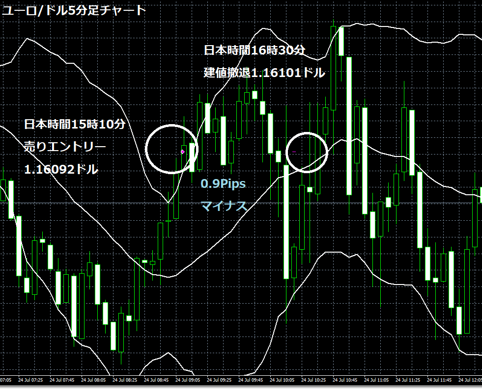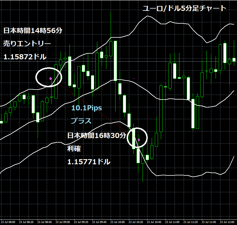 JUGEMテーマ:FX 情報分析 7月23日のOANDA JAPANのデモトレードで自作EA「ロンドンは午前7時」は、日本時間14時56分にユーロ/ドルのショートポジション(ユーロ売りドル買い)を1.15872ドルでエントリーし日本時間16時30分に1.15771ドルでポジションをクローズし10.1Pipsのプラスとなり5,399円の利益となった。(Lot数は0.5。5万通貨) 2019年2月26日からのフォワードテスト178勝92敗(178勝/269トレード、勝率66.17%、引き分け含まず)で436.8pipsのプラスで27万392円の利益となった。 OANDA JAPANのデモ口座の...