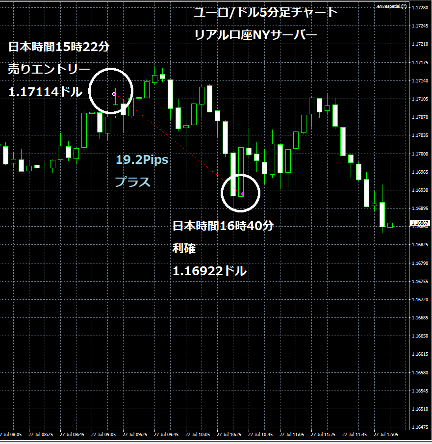 JUGEMテーマ:FX 情報分析 7月27日のOANDA JAPANのリアルトレード(NYサーバー)で自作EA「ロンドンは午前7時」は、日本時間15時22分にユーロ/ドルのショートポジション(ユーロ売りドル買い)を1.17114ドルでエントリーし日本時間16時40分に1.6922ドルでポジションをクローズし19.2Pipsのプラスで10,320円の利益となった。(Lot数は0.51。5.1万通貨) OANDA JAPANリアル口座(NYサーバー) いつもフォワードテストしているOANDA JAPANのデモ口座(東京サーバー)は、15時50分から16時45分までチャートが停止し...