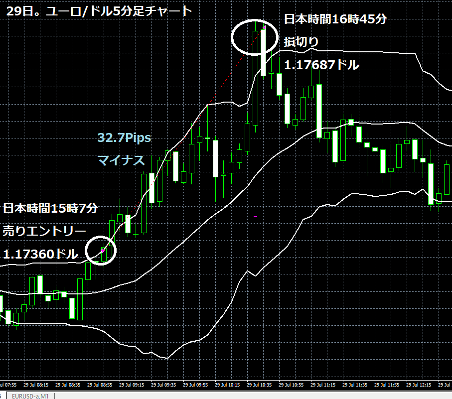 JUGEMテーマ:FX 情報分析 7月29日のOANDA JAPANのデモトレードで自作EA「ロンドンは午前7時」は、日本時間15時07分にユーロ/ドルのショートポジション(ユーロ売りドル買い)を1.17360ドルでエントリーし日本時間16時45分に1.7687ドルでポジションをクローズし32.7Pipsのマイナスで17,175円の損失となった。(Lot数は0.51。5.1万通貨) 2019年2月26日からのフォワードテスト179勝94敗(179勝/272トレード、勝率65.80%、引き分け含まず)で422.4pipsのプラスで26万3,058...
