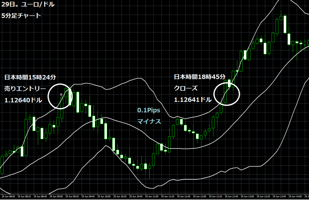 JUGEMテーマ:FX 情報分析 6月29日のOANDA JAPANのデモトレードで自作EA「ロンドンは午前7時」は、日本時間15時24分にユーロ/ドルのショートポジション(ユーロ売りドル買い)を1.12640ドルでエントリーし日本時間18時45分に1.12641ドルでポジションをクローズし0.1Pipsのマイナスとなり54円の損失となった。(Lot数は0.5。5万通貨) 2019年2月26日からのフォワードテスト169勝88敗(169勝/256トレード、勝率66.02%、引き分け含まず)で397.7pipsのプラスで25万2,381円の利益となった。 OANDA JAPANのデモ口座のス...
