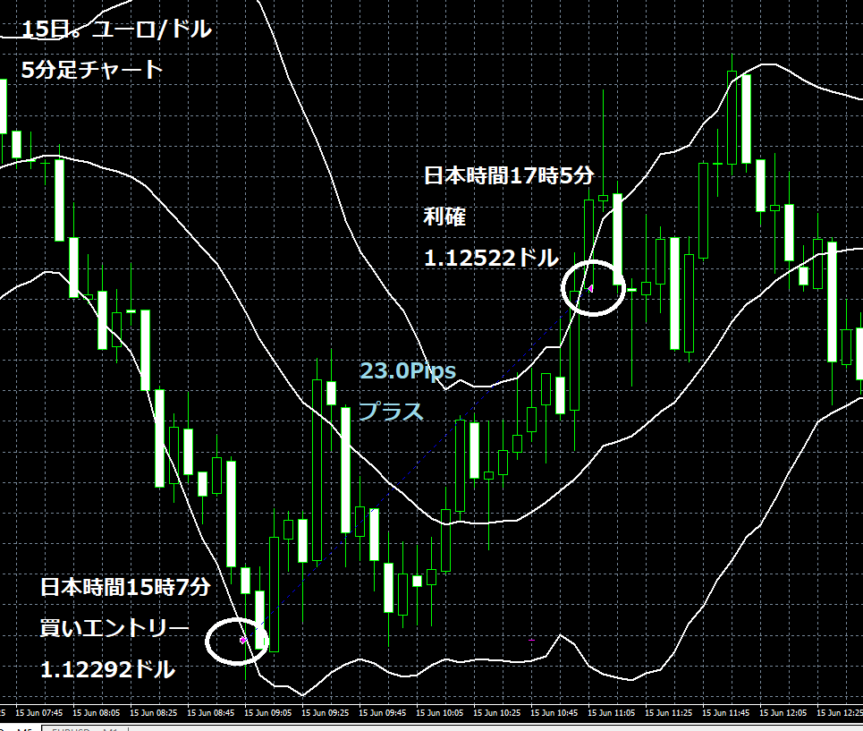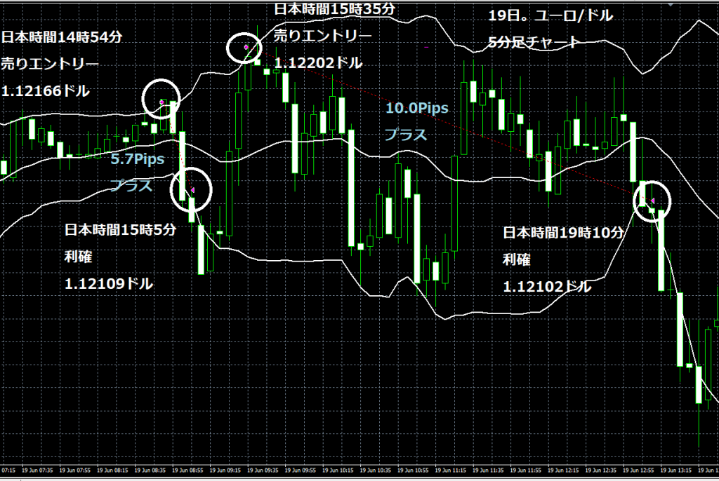 JUGEMテーマ:FX 情報分析 6月19日のOANDA JAPANのデモトレードで自作EA「ロンドンは午前7時」は、日本時間14時54分にユーロ/ドルのショートポジション(ユーロ売りドル買い)を1.12166ドルでエントリーし日本時間15時05分に1.12109ドルでポジションをクローズして5.7Pipsのプラスとなり3,041円の利益となった。(Lot数は0.5。5万通貨) その後、日本時間15時35分にユーロ/ドルのショートポジション(ユーロ売りドル買い)を1.12202ドルでエントリーし日本時間19時10分に1.12102ドルでポジションをクローズして10.0Pipsの...