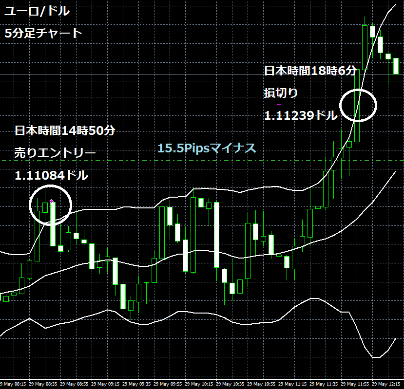 JUGEMテーマ:FX 情報分析 5月29日のOANDA JAPANのデモトレードで自作EA「ロンドンは午前7時」は、日本時間14時50分にユーロ/ドルのショートポジション(ユーロ売りドル買い)を1.1084ドルでエントリーし日本時間18時04分に1.1239ドルでポジションをクローズして15.5Pipsのマイナスで8,325円の損失となった。(Lot数は0.5。5万通貨) 2019年2月26日からのフォワードテスト159勝83敗(159勝/241トレード、勝率65.98%、引き分け含まず)で407.1pipsのプラスで25万7,616円の利益となった。 OANDA JAPANのデモ口座のスプ...