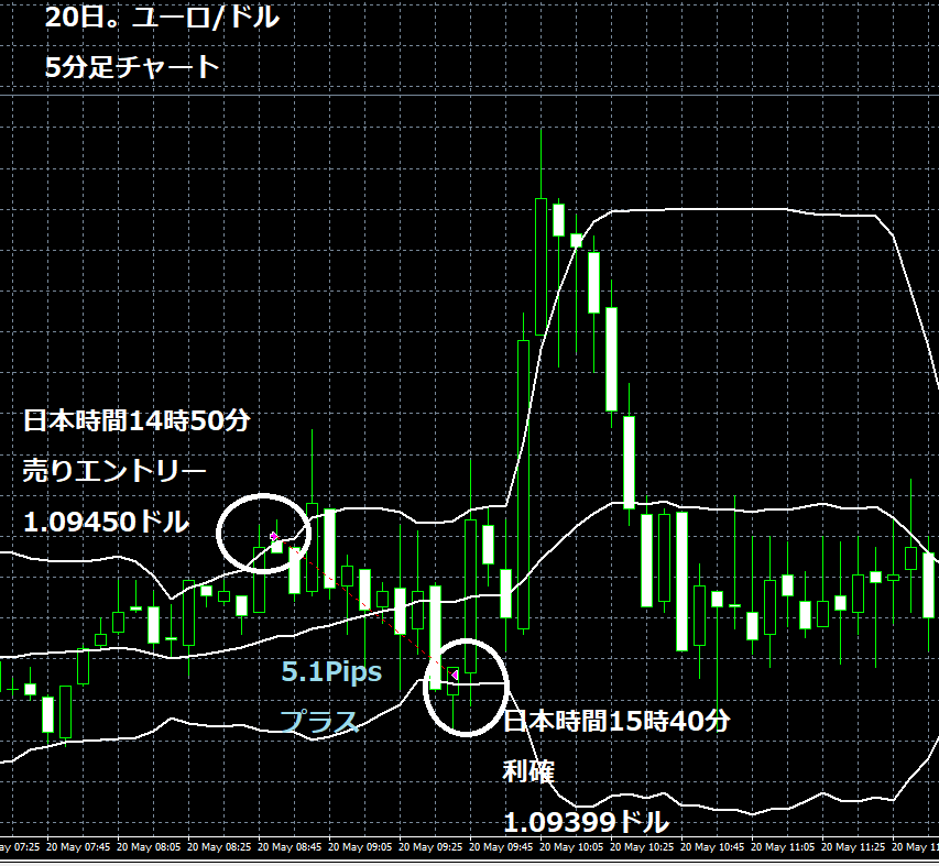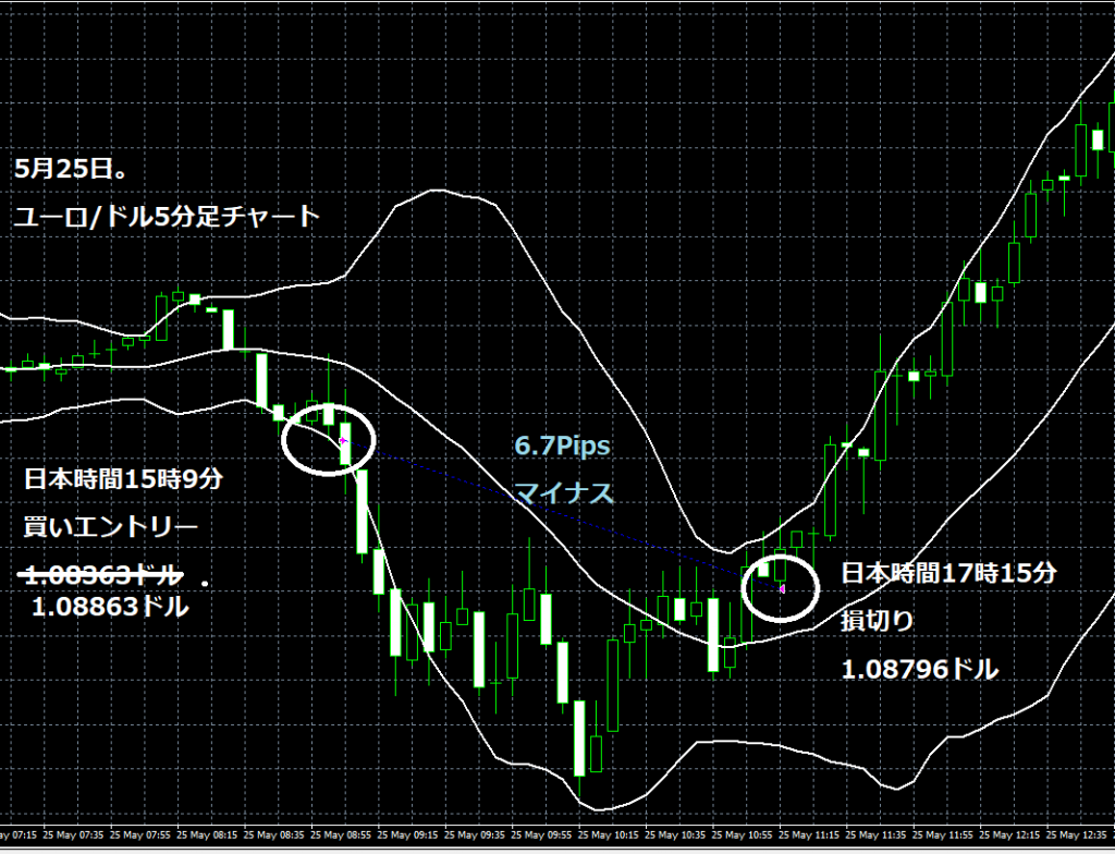 JUGEMテーマ:FX 情報分析 5月25日のOANDA JAPANのデモトレードで自作EA「ロンドンは午前7時」は、日本時間15時09分にユーロ/ドルのロングポジション(ユーロ買いドル売り)を1.08863ドルでエントリーし日本時間17時15分に1.08796ドルでポジションをクローズして6.7Pipsのマイナスで3,616円の損失となった。(Lot数は0.5。5万通貨) 2019年2月26日からのフォワードテスト158勝81敗(158勝/238トレード、勝率66.39%、引き分け含まず)で432.2pipsのプラスで27万1,157円の利益となった。 この日は、イギリスとアメリ...