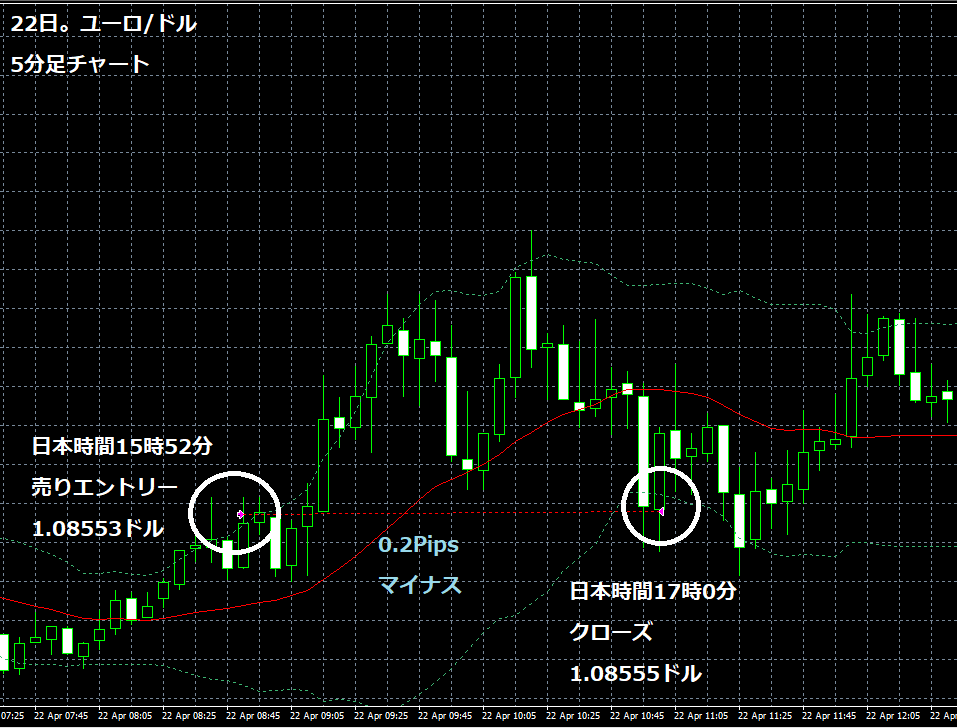 JUGEMテーマ:FX 情報分析 4月23日のFXTF(ゴールデンウエイ・ジャパン)の1000通貨コースでのデモトレードで自作EA「ロンドンは午前7時」は、日本時間14時52分にユーロ/ドルのショートポジション(ユーロ売りドル買い)を1.08553ドルでエントリーし日本時間17時00分に1.08555ドルでポジションをクローズして0.2Pipsのマイナスで108円の損失となった。(Lot数は0.5。5万通貨) 2019年2月26日からのフォワードテスト147勝73敗(147勝/219トレード、勝率67.12%、引き分け含まず)で414.7pipsのプラスで26万2,001円の利益...